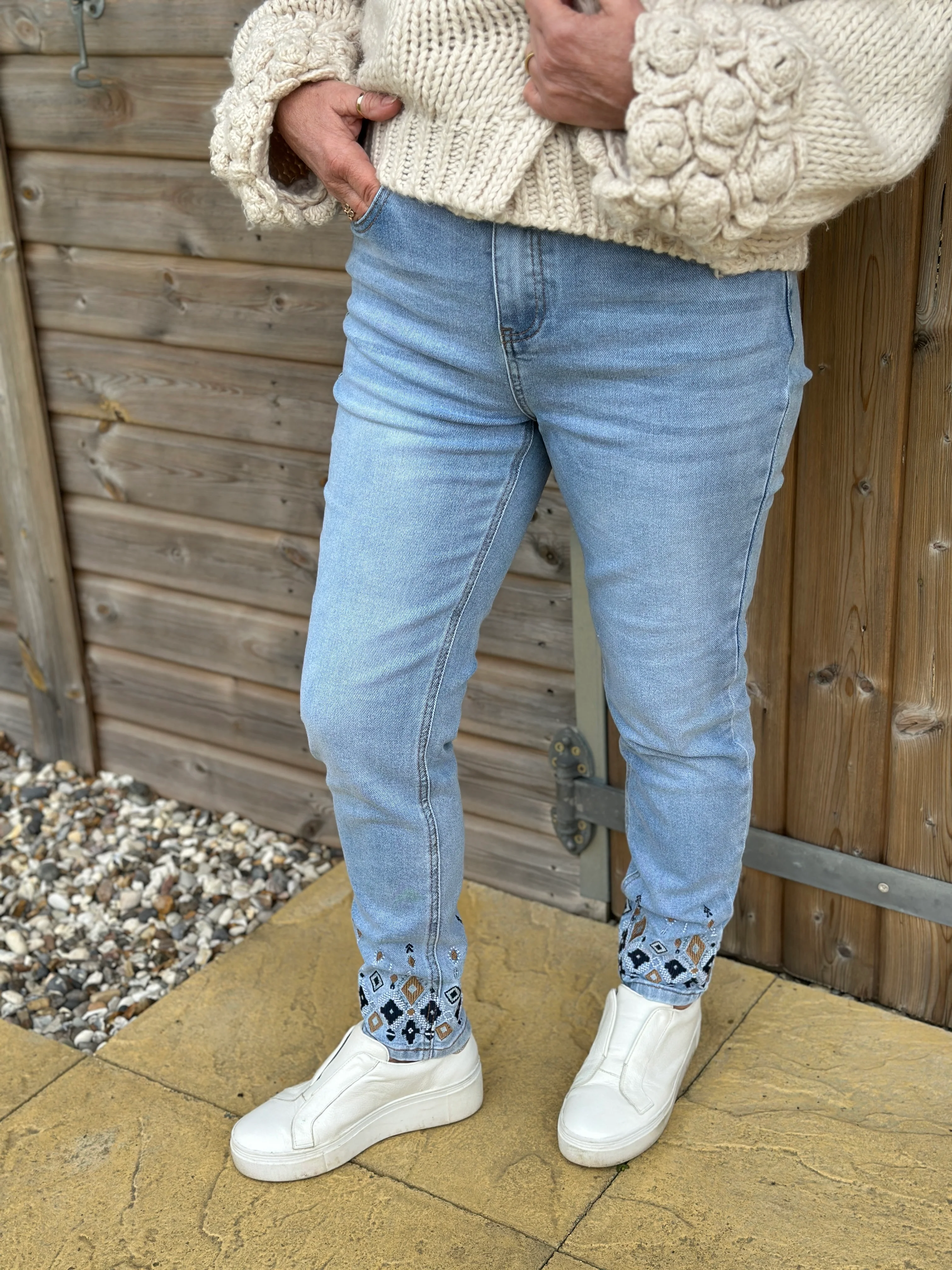 Add a stylish twist to your denim collection with our Embroidered Hem Jeans, featuring a beautiful Aztec-inspired stitched detail at the ankle. Designed for both comfort and style, these jeans offer a flattering fit with a touch of boho-chic charm.