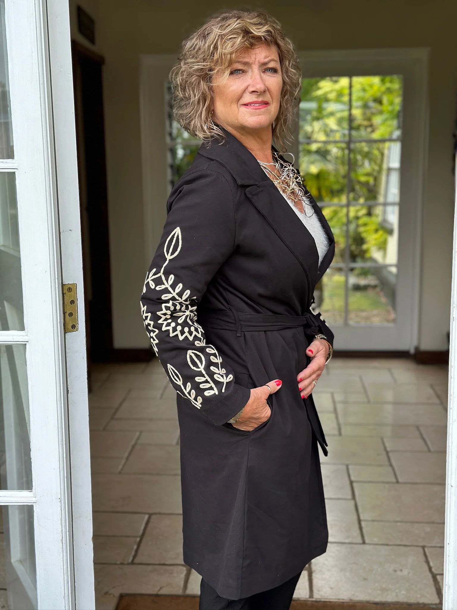 This black trench coat features stunning floral embroidery and a fitted, mid length design. Made from a comfortable cotton blend, this coat is both stylish and practical.