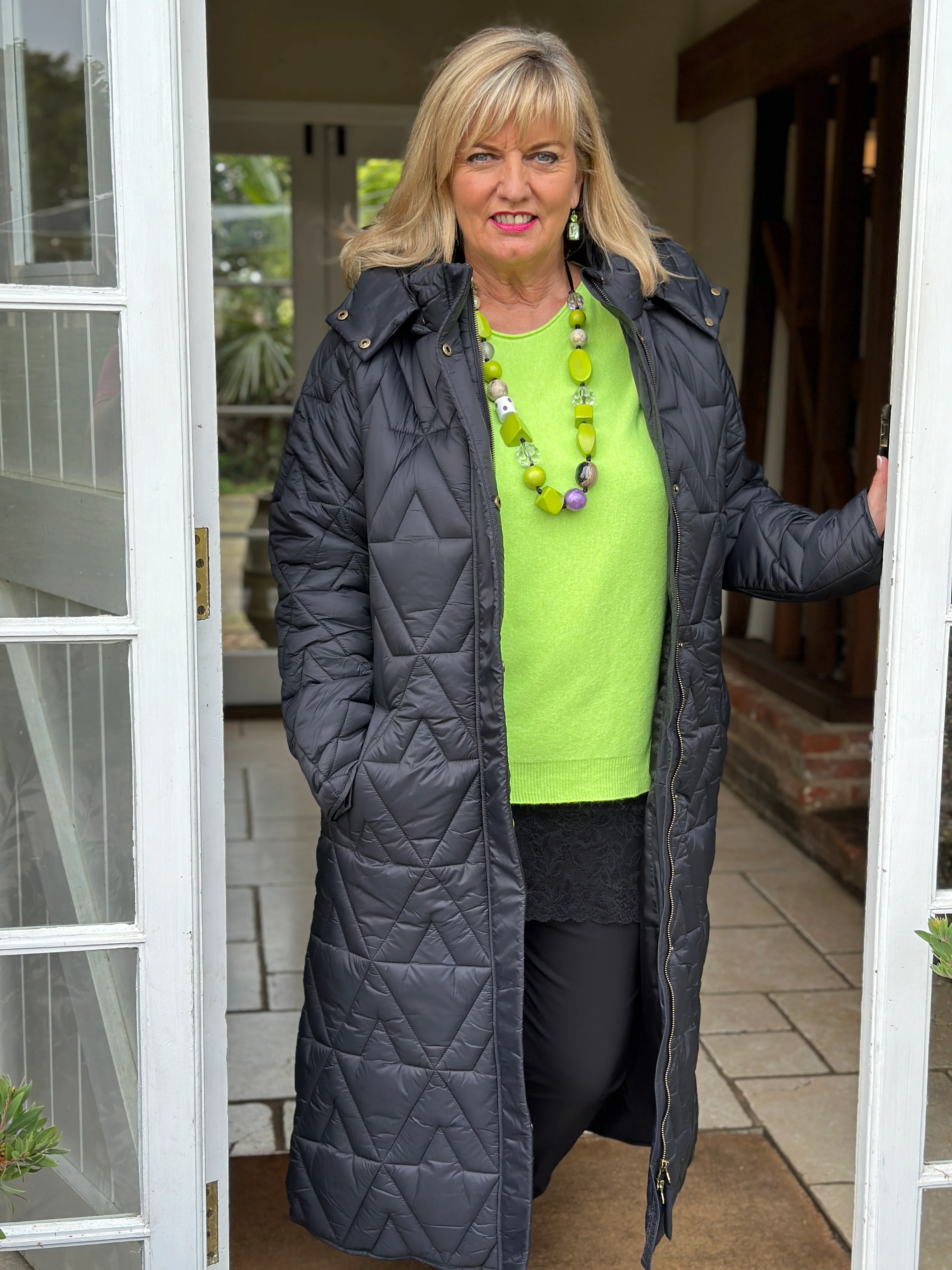 This diamond-quilted coat is designed to keep you snug when the temperature drops.